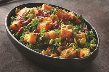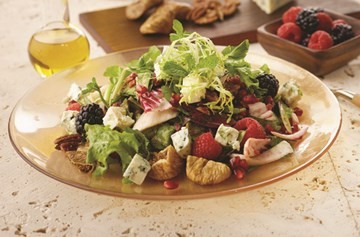 <p>Baby spinach with blueberries, raspberries, blackberries, strawberries, cous cous, almonds, peanuts, honey raspberry vinaigrette dressing.</p>